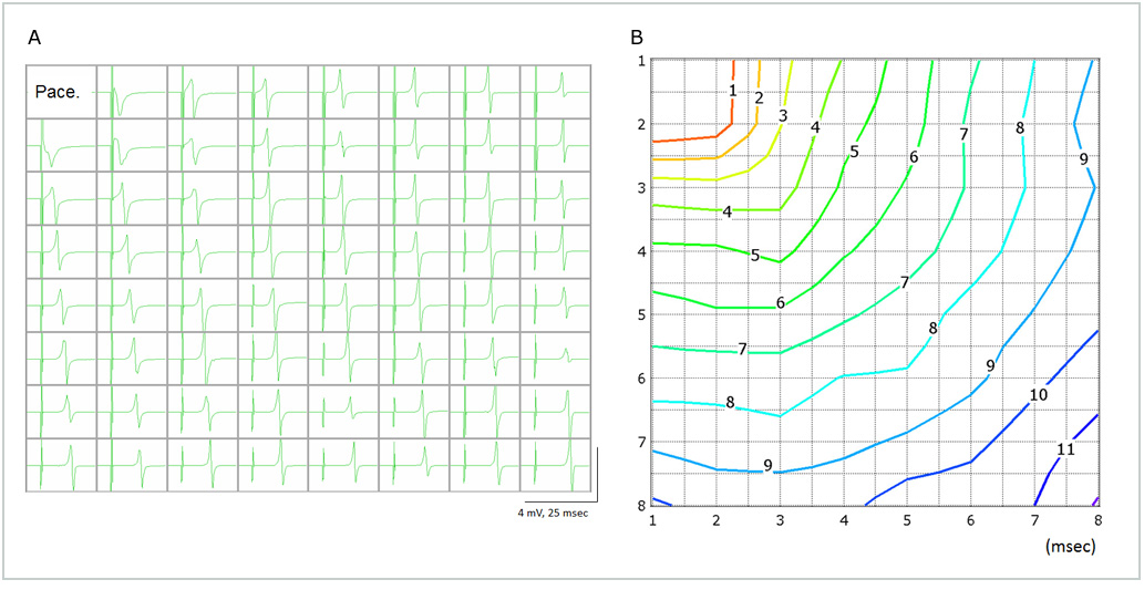 A: Signals recorded from human iPS cell-derived cardiomyocytes. Electrode 1 was paced and signals were acquired from the remaining 63.