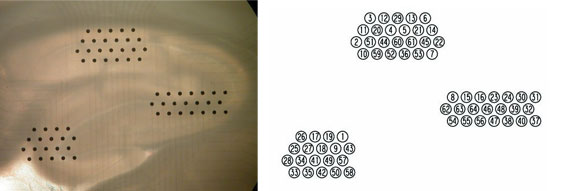 Micrograph of mouse hippocampal slice and arrangement of microelectrodes
