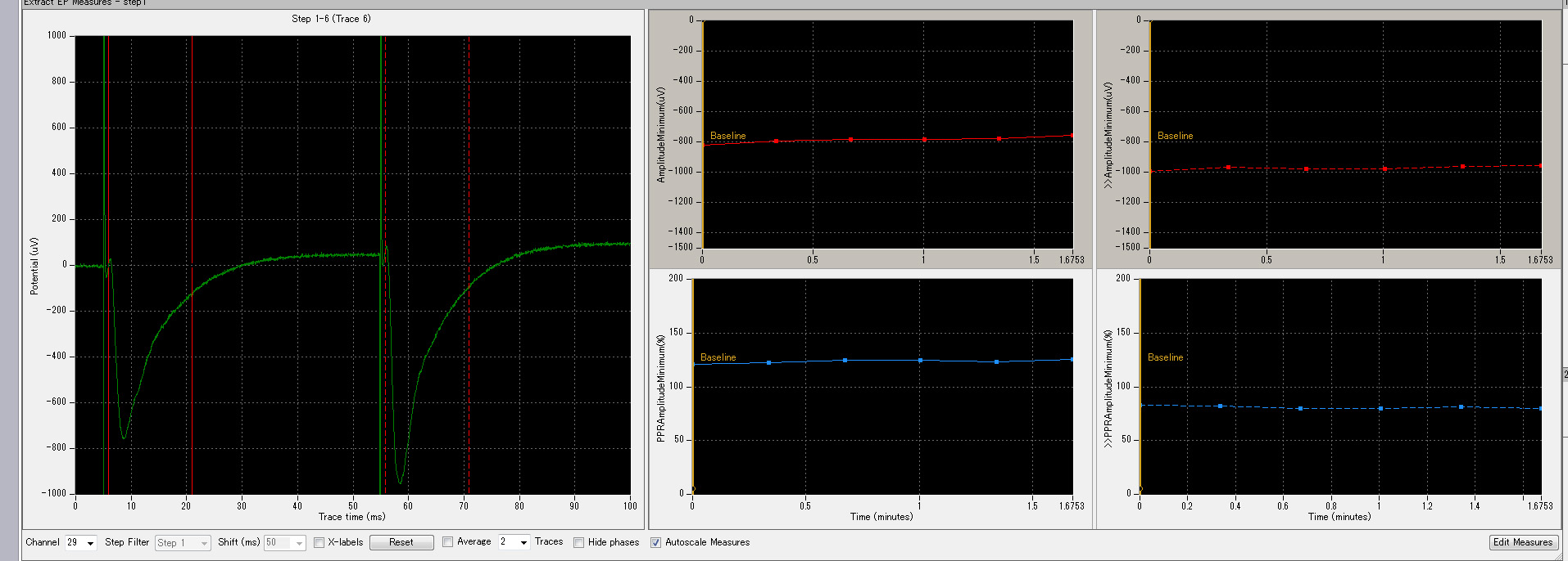 [Left] extracted evoked signal. [Right] The top charts (red) show the time course of measured minimum amplitude for the first (left) and second (right) pulse . The bottom charts (blue) show the paired pulse ratio for the Amplitude Minimum. The left chart shows the percent change in the first pulse compared to the second pulse while the right chart shows the percent in the second pulse compared to the first pulse.