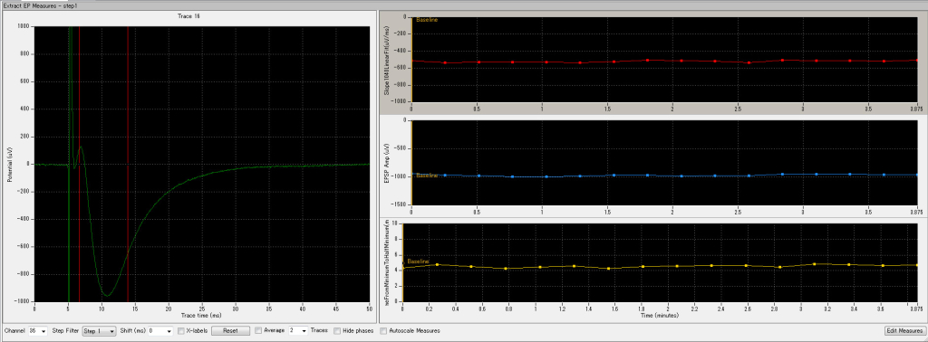 [Left] extracted evoked signal (fEPSP). [Right] Time course of analyzed 1) Slope 10-40% (red), 2)Amplitude Minimum (blue), and 3) Time from minimum to half minimum (yellow) are measured and graphed.